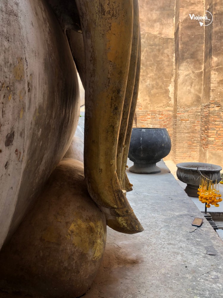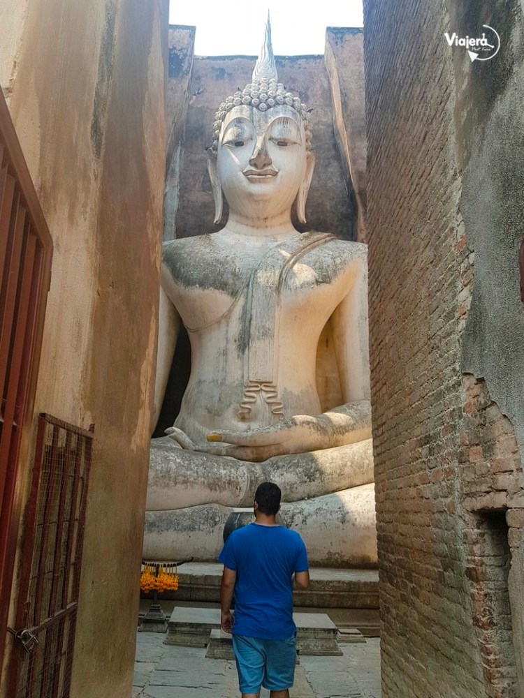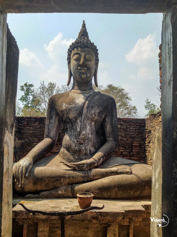 La cereza de mi pastel llamado Sukhothai fue este templo que en español se llama “El templo del Árbol Sagrado”, pues en él se encuentran muchos árboles Bodhi en el que se dice el Buda alcanzó la iluminación eterna. En el que se encuentra el Buda sentado más increíble y grande que vi en Tailandia, el Phra Achana, con más de 15 metros de altura. Este Buda, como la gran mayoría en el parque se encuentra en posición bhumisparsha (sentado, con una mano sobre la rodilla y los dedos apuntando hacia abajo y la otra sobre el regazo con la palma hacia arriba).