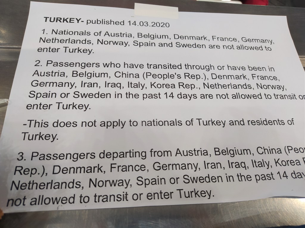 Así, 23 días pasamos recorriendo el “País de las sonrisas” y una escapadita cortita a Camboya, capítulo aparte en este blog. Regresábamos a Turquía, donde estábamos viviendo, el 14 de marzo del 2020. Al llegar a counter de Turkish Airlines del aeropuerto de Bangkok nos encontramos con una sorpresa. En un cartelito apenas pegado horas antes decía: “Ciudadanos de Austria, Dinamarca, Francia, Alemania, Holanda, Noruega, España y Suecia no están autorizados a ingresar a Turquía”. El virus ya había entrado a esos países con fuerza, y Turquía con 0 casos al momento, se estaba blindando. Con el corazón casi parado porque Lucien es francés, proseguimos la lectura: “Esto no aplica para nacionales y residentes de Turquía”. Recobramos la respiración, porque por suerte ambos teníamos nuestro carnet de residencia turca, nos chequeamos y dejamos Tailandia agradecidos y felices de lo vivido.