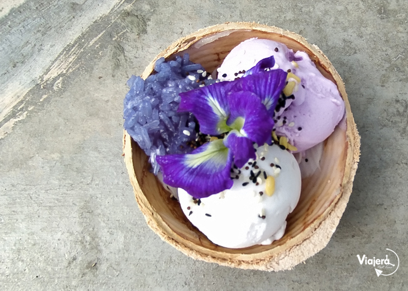 Bueno, ya volví, les decía que probé un helado de coco en Chang Rai con sticky rice (arroz pegajoso), que tuve que inmortalizar en una foto, no solo por lo rico que estaba, sino por lo bello de su presentación.