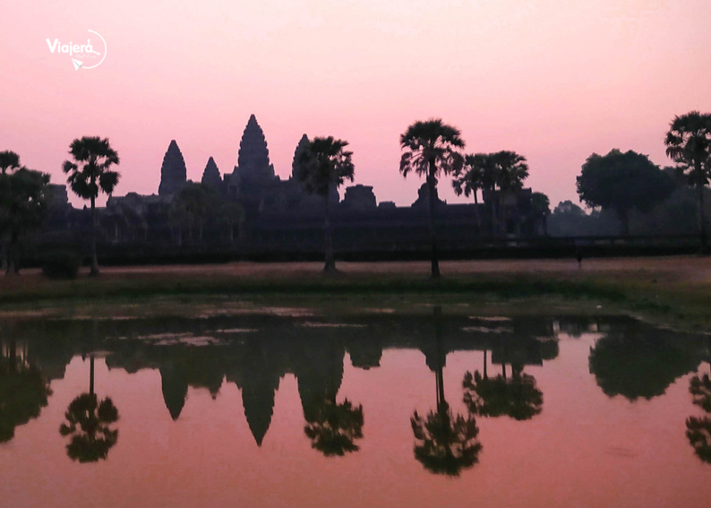 No te desesperes, y trata de alejarse un poco de la multitud hacia los laterales del lago, toma en la laguna un par de fotos y luego muévete a esperar la subida del sol a un lugar con menos gente. Te aseguro que desde cualquier punto podrán ver el sol tintinear entre las torres de Angkor Wat. Eso sí, deben tener paciencia, que primero vienen los violetas, luego parecerá que no pasa nada, hasta que alrededor de las 7 am cuando el sol comienza a subir lentamente, disfrutarás de un sol enorme, naranja que iluminará todo a tu alrededor. ¡Simplemente fantástico!