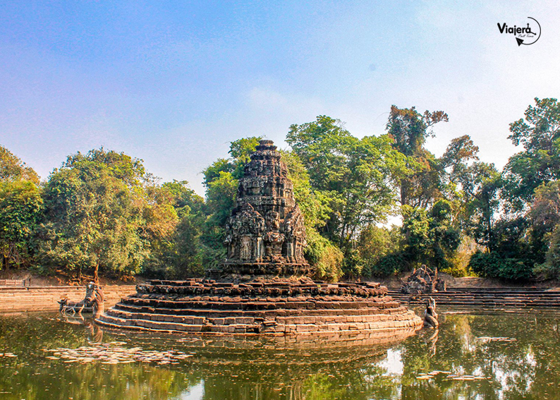 El templo fue construido con forma de una flor de loto y se encuentra en lo que una vez fue el depósito de agua de Preah Khan en una isla artificial. para llegar deberas atravesar un extenso puente de madetra sobre el lago