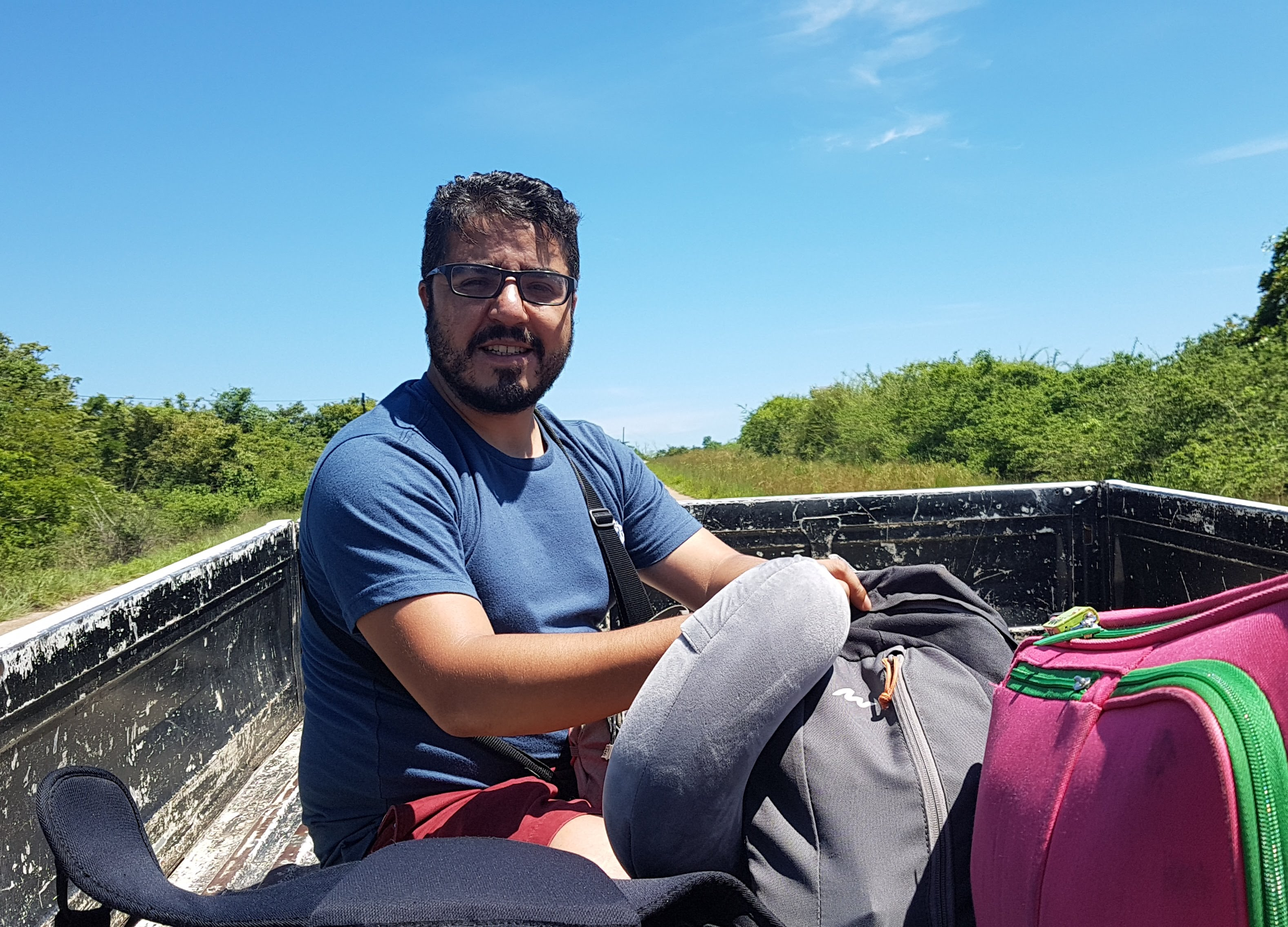 Nos equivocamos de ruta, casi tuvimos que treparnos a una moto lineal con maletas encima; luego tiramos dedo para que nos lleven al paradero de otros transporte público, este era una especie de camionetas Pick Up que viajaba a toda velocidad, con un montón de gente arriba, sentados en los borde de su tolva y bajo el achicharrante sol. Todo este viaje, entre costos de los transportes y propinas nos costó 40 USD. Todo bien para una aventura, pero no lo quería volver a hacer porque ciertamente no es muy seguro.
