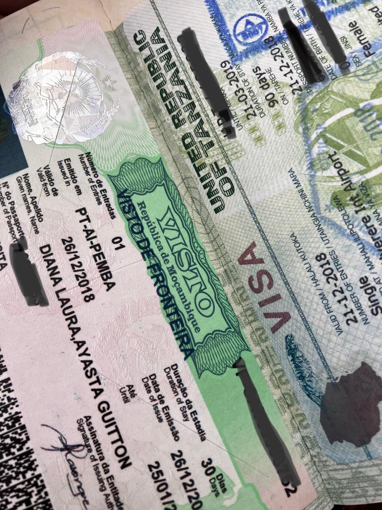 Los siguientes dos días lo pasamos en Dar es Salaam, recibiendo la Navidad con la familia. No imaginaba que, a partir de aquí, no volvería a pasar un 24 de diciembre en lo que había sido mi ciudad por 40 años, Lima, y con mi familia peruana. El 26 de diciembre del 2018 dejamos Tanzania y tomamos un vuelo a Pemba en Mozambique, punto en el que ingresamos a este país que recorrimos de norte a sur. EL vuelo fue corto, pasamos por migraciones en esta ciudad, fue súper sencillo, al igual que en Tanzania, simplemente bajamos del avión, entramos en el pequeño aeropuerto, donde nos tomaron una foto, pagamos el costo del visado (50 USD) y nos pegaron la visa en el pasaporte.