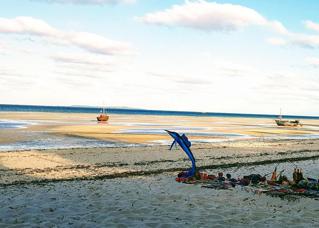 Resuelto el tema, llegamos a Tofo en donde nos quedamos 3 días más. Tofo es un pequeño pueblo costero en el sur de Mozambique, a 8 horas de la capital. Es famoso para los viajeros que llegan en busca de su playa extensa, el surf, las actividades de buceo y nadar con tiburones, nos quedamos en un hotel muy lindo y elegante al estilo tiendas de safari, con ducha al aire libre. Pasamos allí 3 días, la playa que más nos gustó allí fue Playa Barra, nos hubiera gustado quedarnos más tiempo, pero debíamos continuar la ruta.