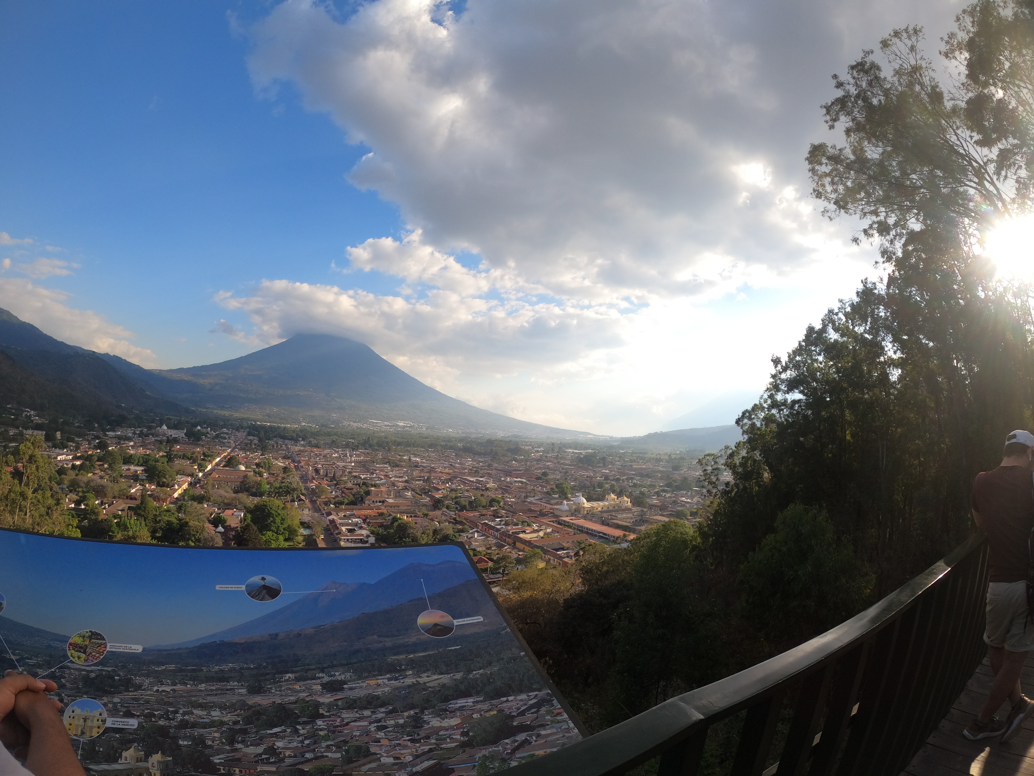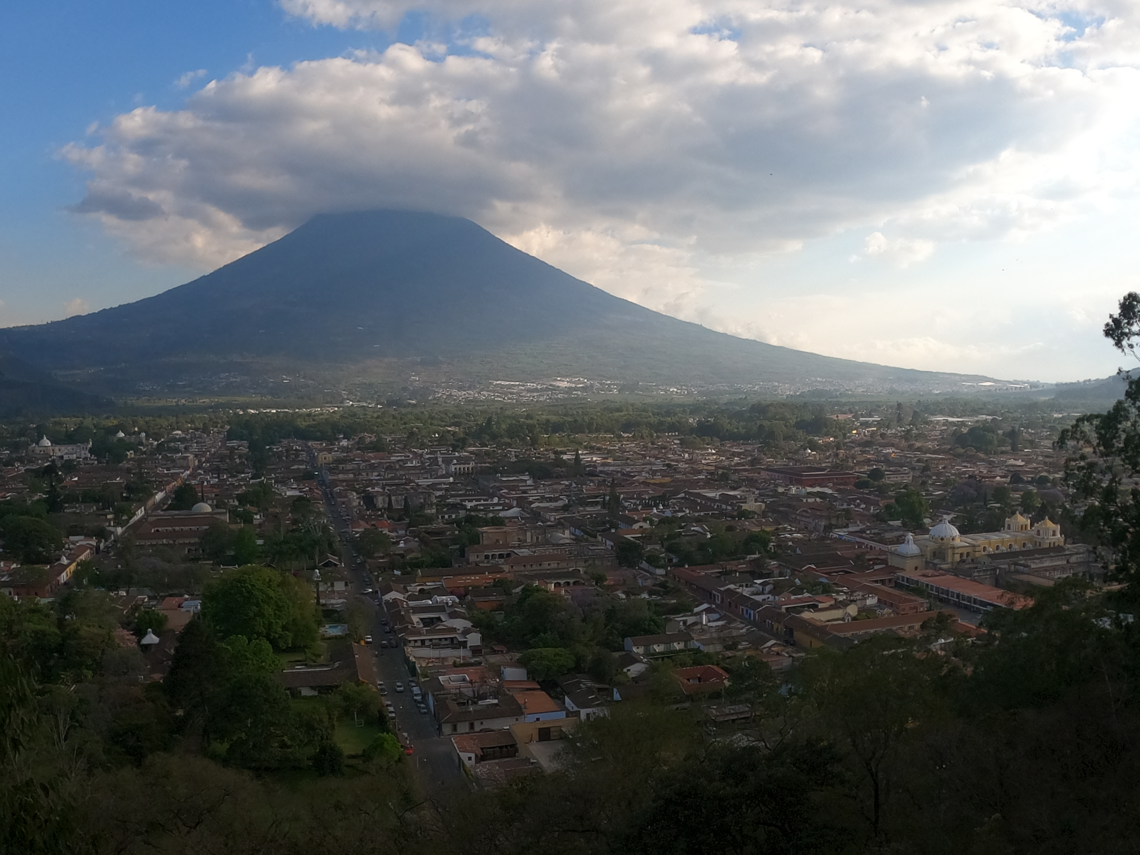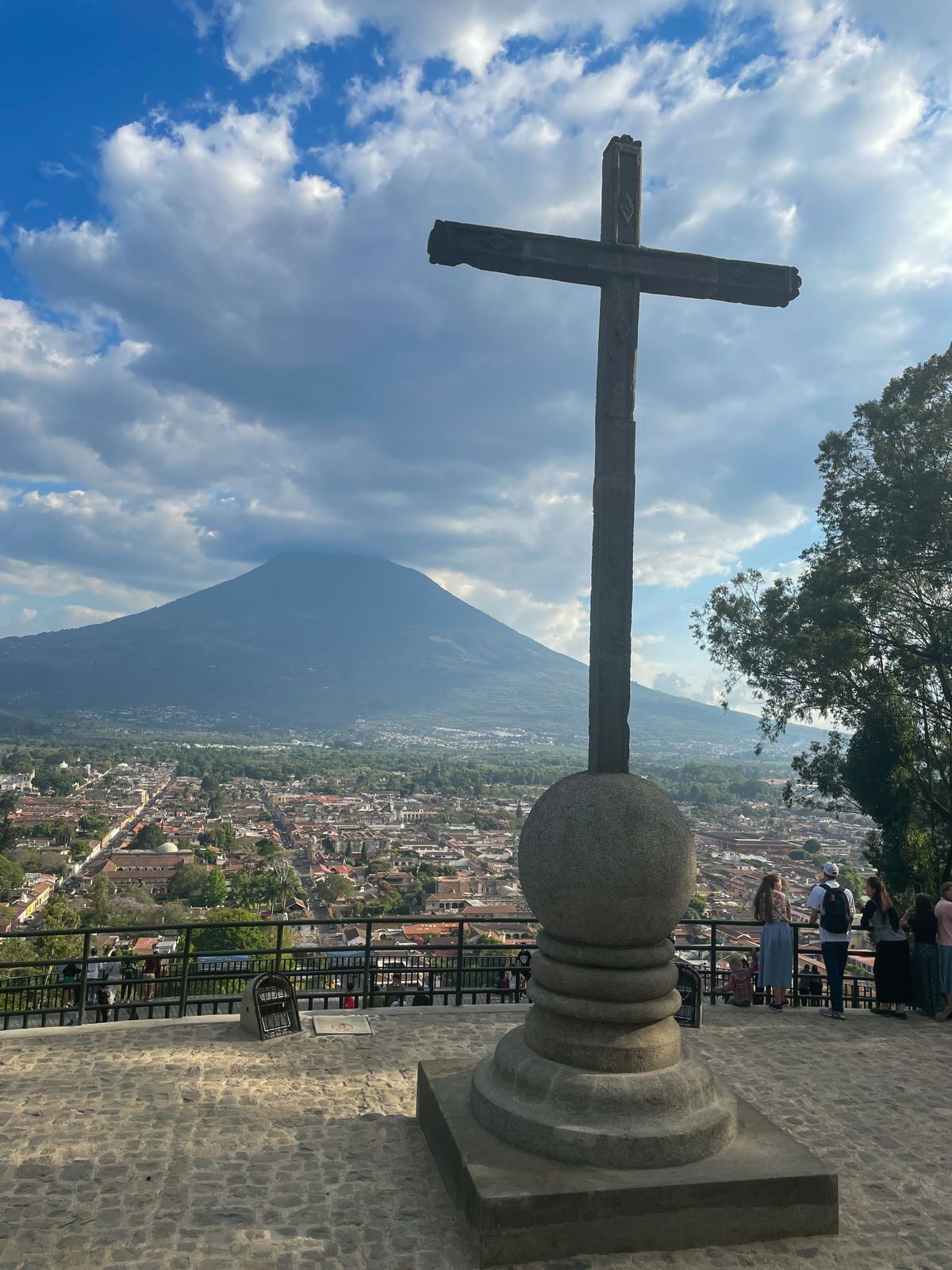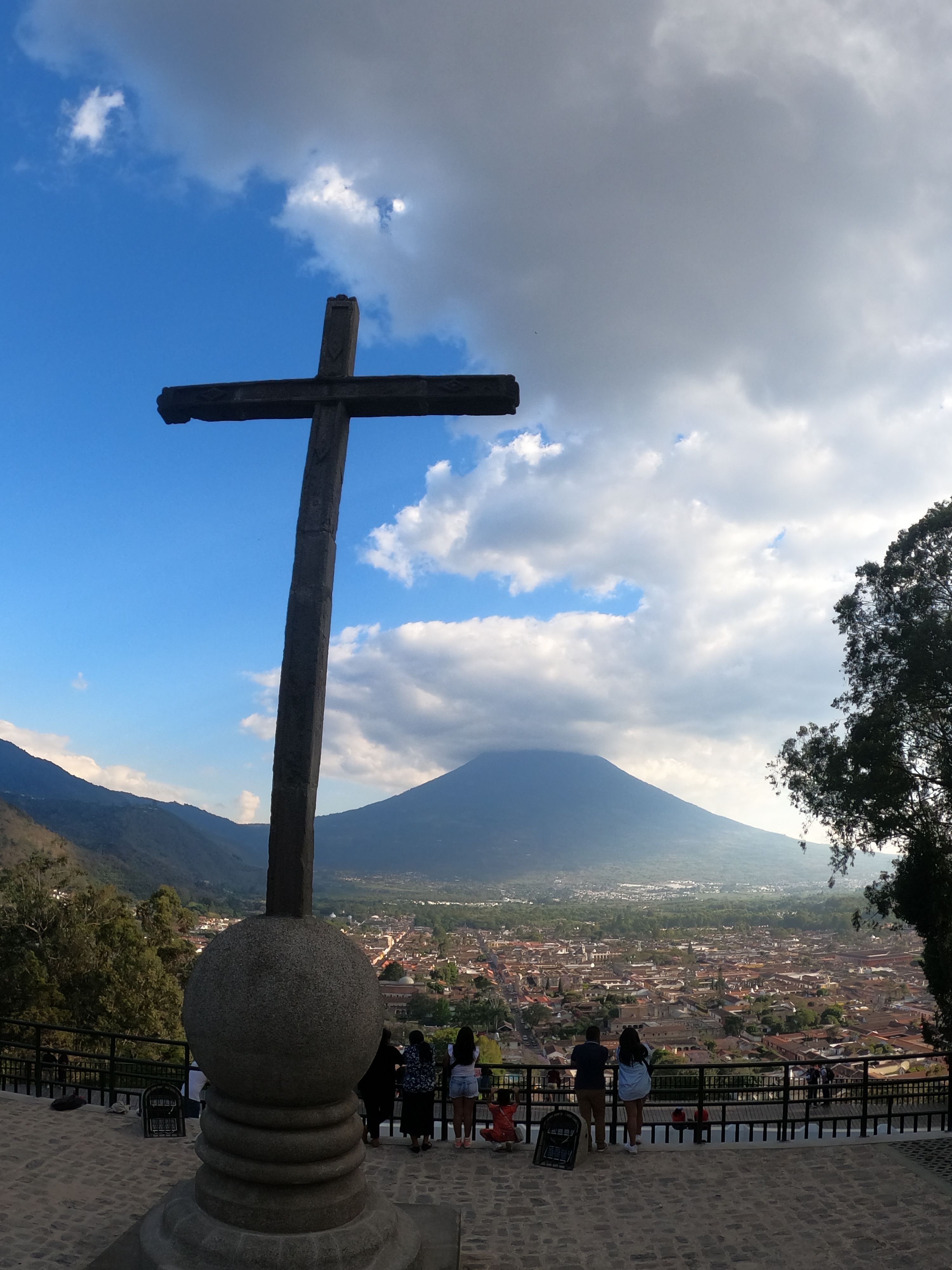 El cerro de la Cruz, o cerro de la Candelaria, es el mejor lugar para ver toda Antigua desde lo alto. Para llegar al mirador se debe llegar al inicio del sendero que se encuentra al final de la 3ra Avenida Norte. El recorrido es corto (unos 30 minutos), pero cuesta arriba por un sendero bien señalizado y con escalinatas. Una vez arriba, si te toca un día despejado, podrás encontrar una gran cruz y disfrutar de una vista muy hermosa del trazado de la ciudad, el Valle de Panchoy y los imponentes volcanes de Agua, de Fuego y el Acatenango.
