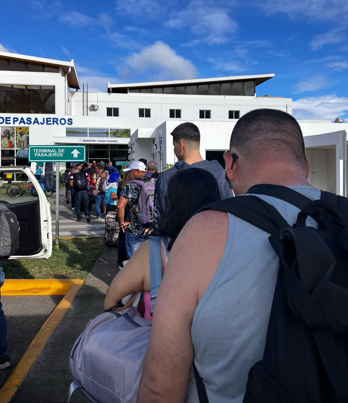 Después de unas 7 horas desde el centro de San José llegamos al paso fronterizo Peñas Blancas. El proceso para pasar la frontera fue bastante sencillo, aunque súper demorado ya que viajamos el 23 de diciembre y había muchísima gente queriendo hacer lo mismo que nosotros. Muchísimos nicaragüenses viven en Costa Rica y regresan a visitar a sus familiares en fiesta de fin de año así que ya pueden imaginarlo. La salida de Costa Rica fue más rápida ya que en el bus solo nos pidieron los pasaportes y ellos los hicieron sellar (pagamos 9 USD cada uno como impuesto de salida).