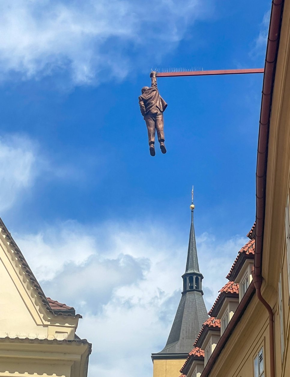 Para finalizar el día antes de nuestro vuelo de retorno a París, dimos un ultimo paseo por la ciudad, pasamos frente al Teatro Nacional, la Filarmónica Checa y caminamos sin prisa por las calles del centro, descubriendo curiosidades como la estatua del hombre colgado.