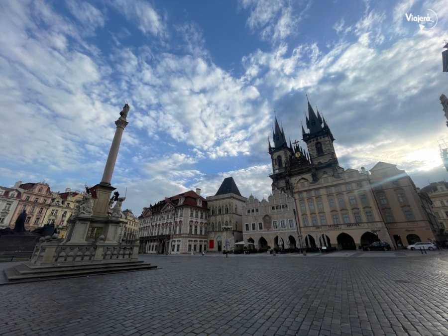 La Plaza de la Ciudad Vieja es el centro neurálgico de Praga y el corazón de la ciudad. Llegar a las 7 a.m. nos permitió disfrutarla vacía, contemplando con calma sus monumentos. En la plaza se encuentra, además del reloj astronómico, el viejo ayuntamiento y la Iglesia de Nuestra Señora de Tyn, abierto al público desde las 10 a.m. Es una iglesia del siglo XIV de estilo gótico por fuera y decoración barroca por dentro, es uno de los emblemas de la ciudad.