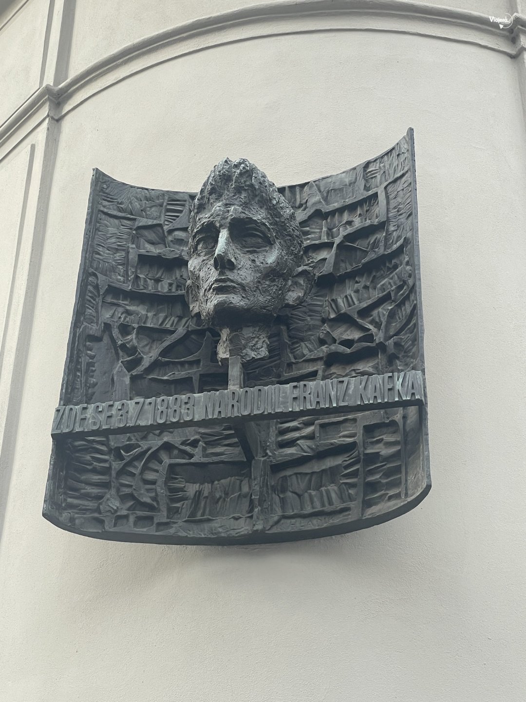 Cabeza de Kafka. Luego de disfrutar el espectáculo del reloj caminamos unos 10 min hasta la Cabeza de Kafka, ubicada en la ciudad nueva. Esta es una escultura moderna en honor al escritor checo. El gran busto hecho de paneles giratorios se construye y de-construye cada hora, y va girando por 15 minutos.