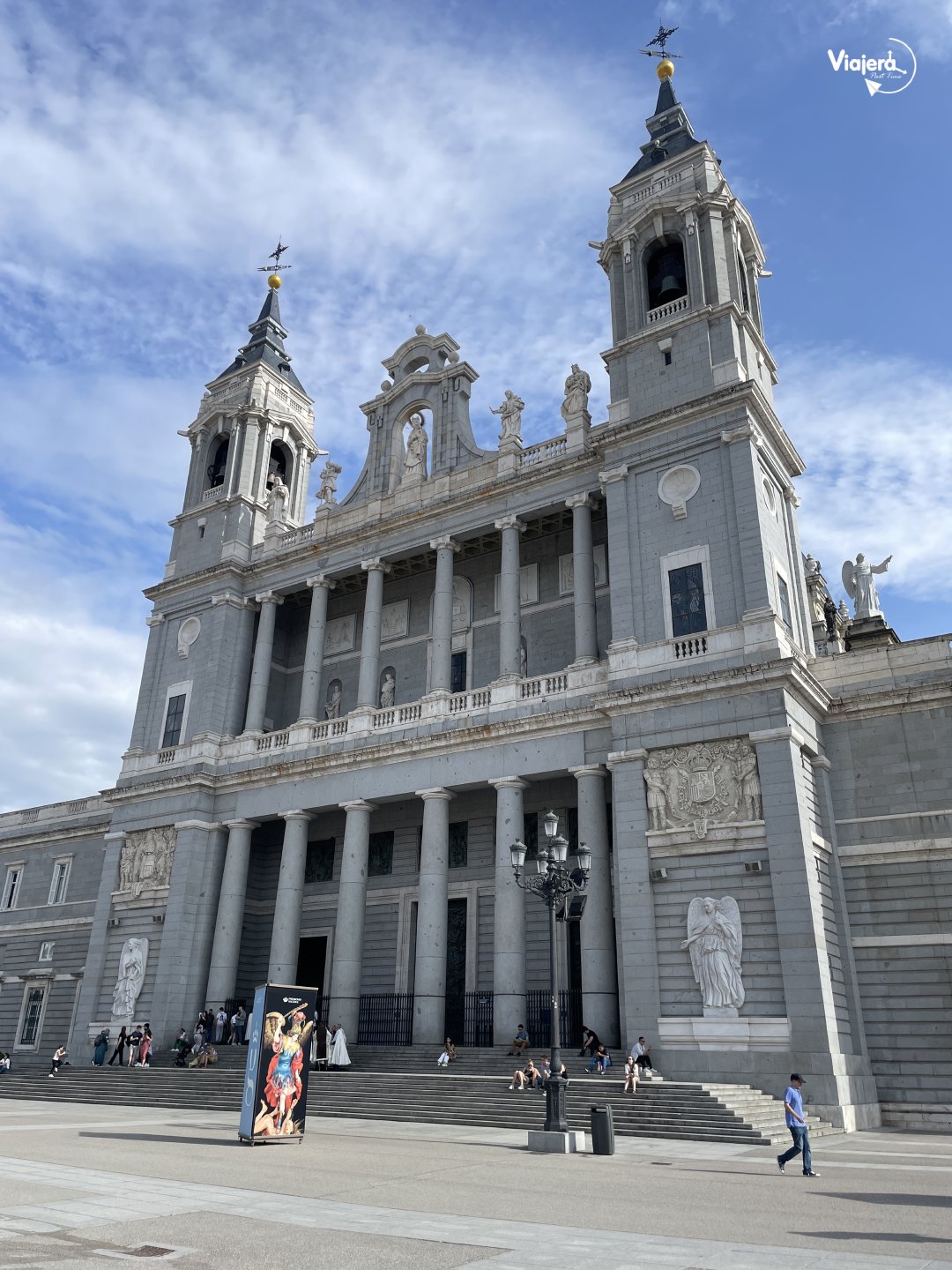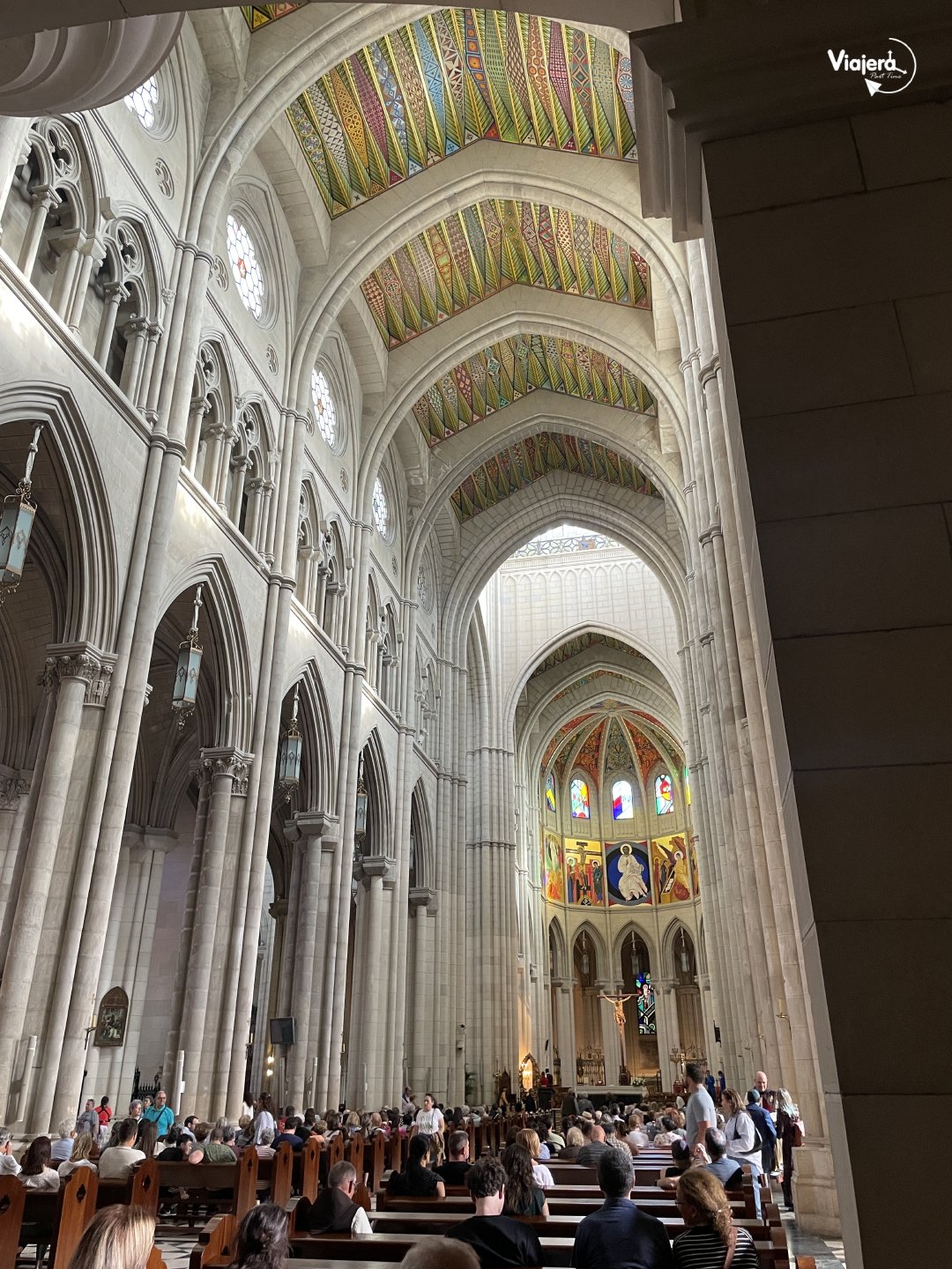 Frente a él, se encuentra la Catedral de la Almudena, la iglesia más importante de la ciudad, construida entre finales del siglo XIX hasta finales del XX. Esta enorme Catedral destaca por su estilo moderno y luminoso y tiene diversos estilos arquitectónicos entre ellos: el neoclásico, neogótico (por dentro) y neorromántico en la cúpula, desde donde hay vistas panorámicas de la ciudad. El precio para entrar a la catedral es de 1 euro y al museo y cúpula 7 euros.