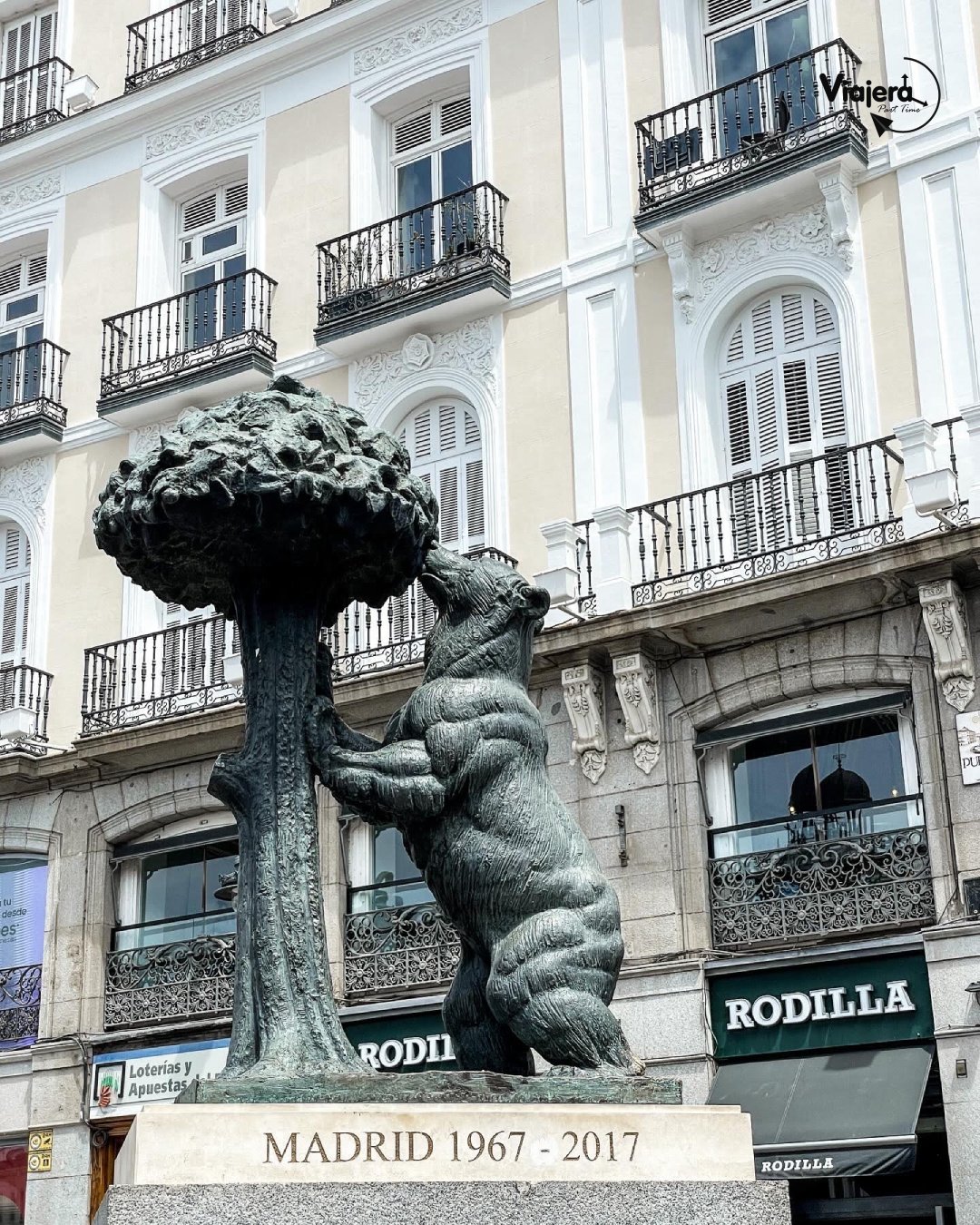 Aquí se encuentra también el Kilómetro Cero, desde donde parten todas las carreteras radiales de España. Otro de los emblemas o símbolos de Madrid se encuentra también en esta plaza, si buscan bien en una de sus esquinas seguro que verán largas colas, y es que allí se encuentra la famosa estatua del Oso y el Madroño, símbolo de la ciudad, que representa la historia y la identidad madrileña. Nosotros no somos de hacer cola para fotos, pero tuvimos suerte y el día que dejábamos Madrid, salimos a las altas horas de la madrugada a tomar el metro, la plaza estaba vacía y claro que aprovechamos para la foto.